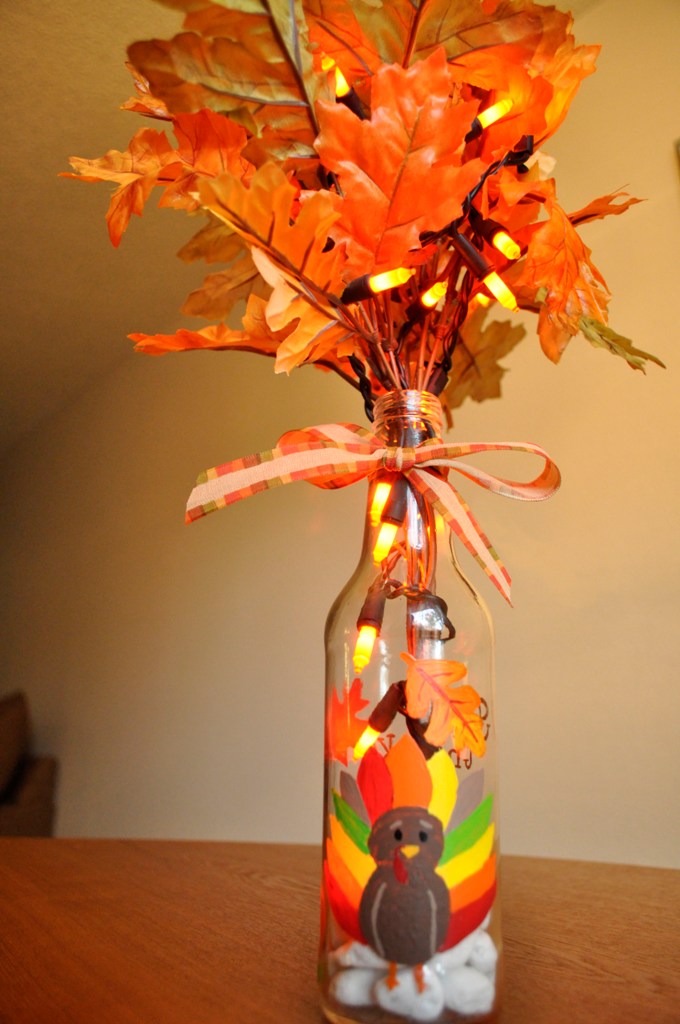 2. Paint desired art onto the bottle. Be creative. Paint what thanksgiving means to you. I painted a turkey, fall leaves, a pumpkin, Pilgrim and Indian hat with the message "give thanks."